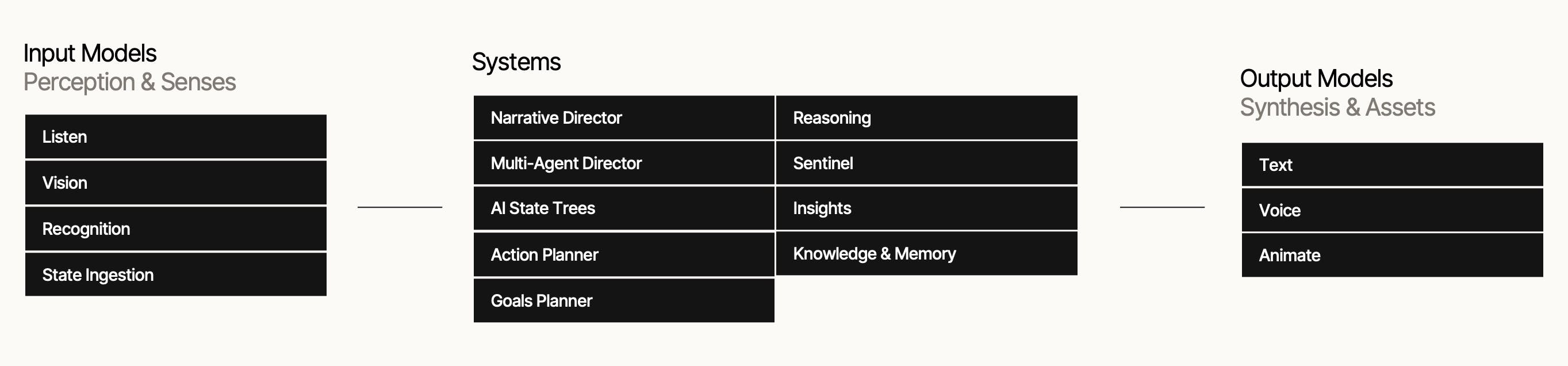 Inworld's AI agents go beyond a simple prompt and draw from a pipeline of specialized machine learning components. This modular system of Inworld AI Components – that include both models and systems – enables our AI to generate complex, context-aware behaviors that go beyond LLMs to provide gameplay mechanics that respond to the evolving state of the game world and player inputs.