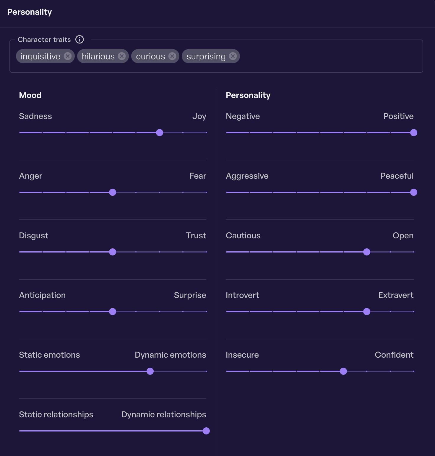 Creating a character with Inworld is easy. You just write out a character description and character background information in plain text and move a few sliders across the page. Anyone can do it.