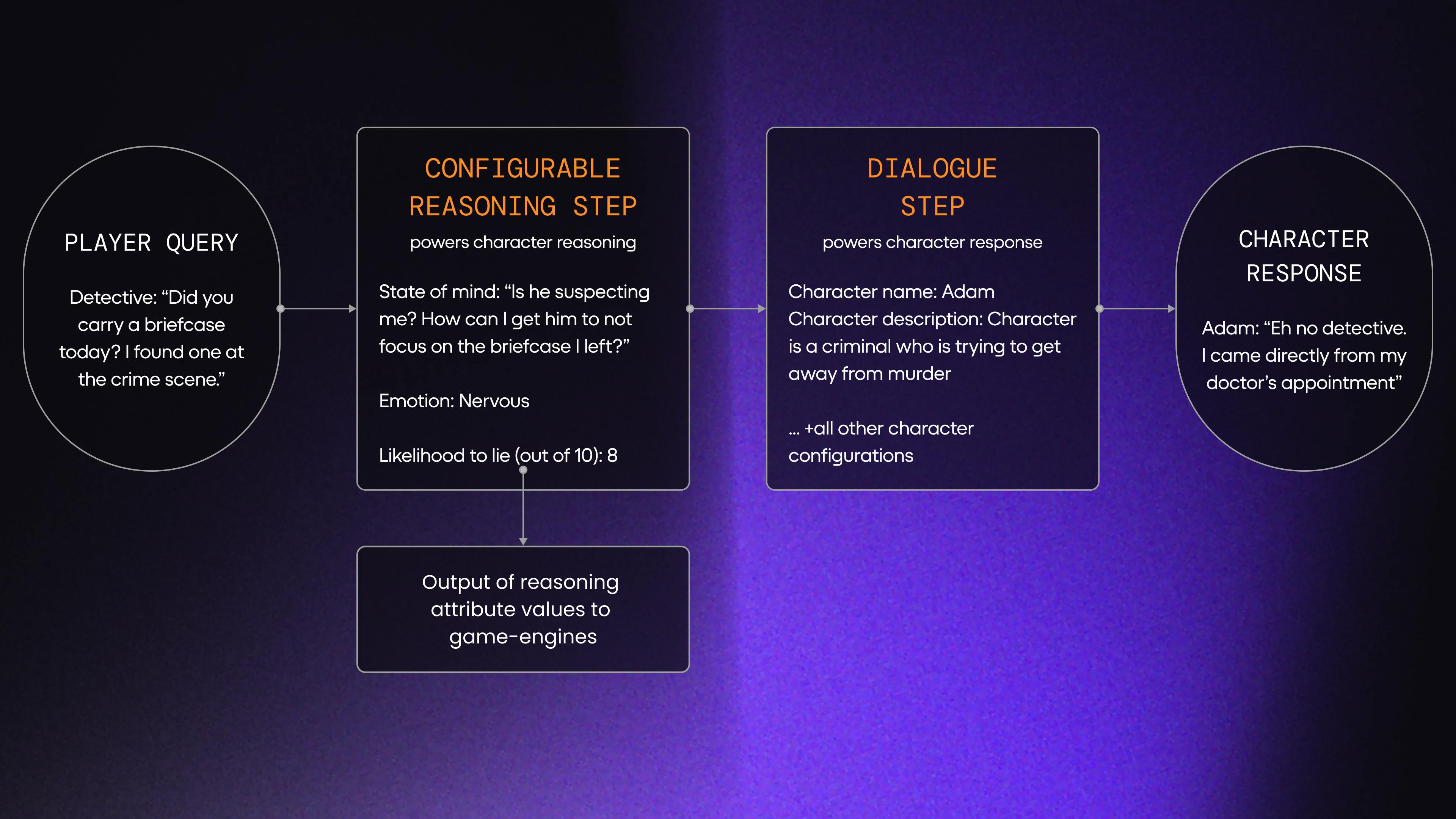 Our Configurable Reasoning module allows developers to add a context-rich reasoning step that gives them more control over and fidelity from their characters – and more opportunities to experiment with what’s possible.
