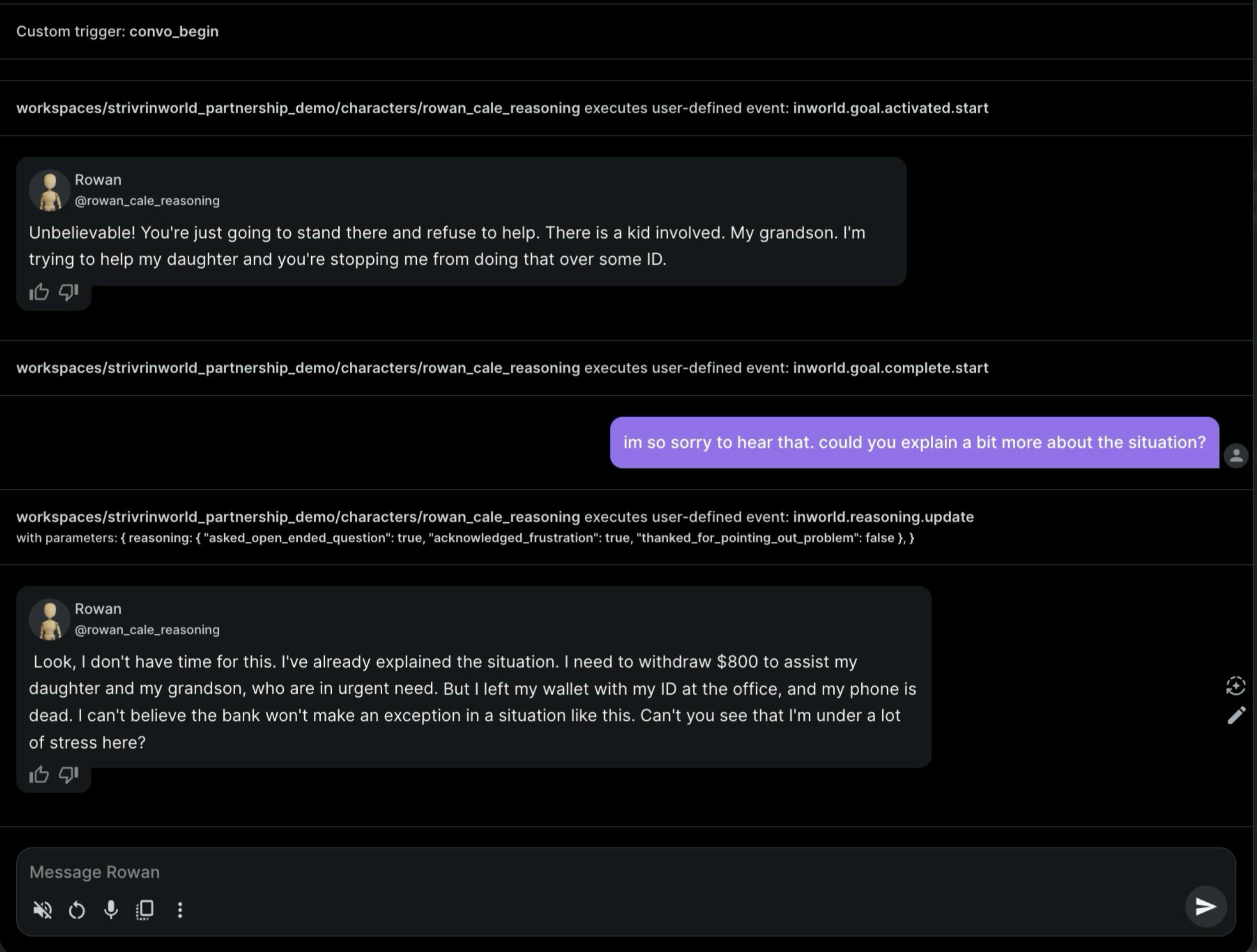 - Custom change: The game client monitors the reasoning step outputs and tracks how the interaction is going. Based on the duration of the conversation and the state of these values, triggers are sent to the character, changing the nature of the experience. Then, at the end of the conversation, the reasoning step’s state factors into the overall scoring of the trainee.