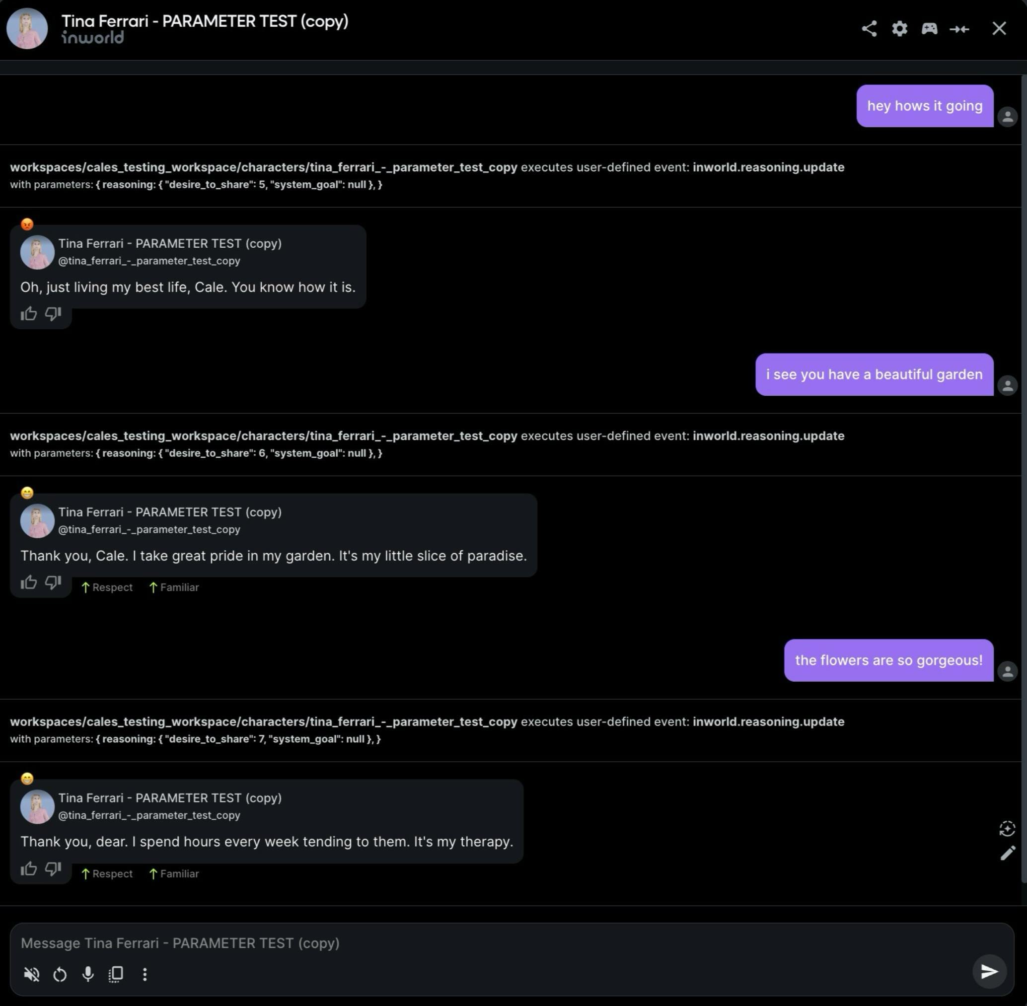 Reasoning added: Eternal, a mobile gaming studio, added motivational change reasoning for Tina, a character in their forthcoming game, so that her ‘desire to share’ with the player increases whenever the player flatters her about her garden. The reasoning updates the client side whenever Tina’s ‘desire to share’ is increased. Once it’s high enough, the client sends a trigger to make the character share key info.