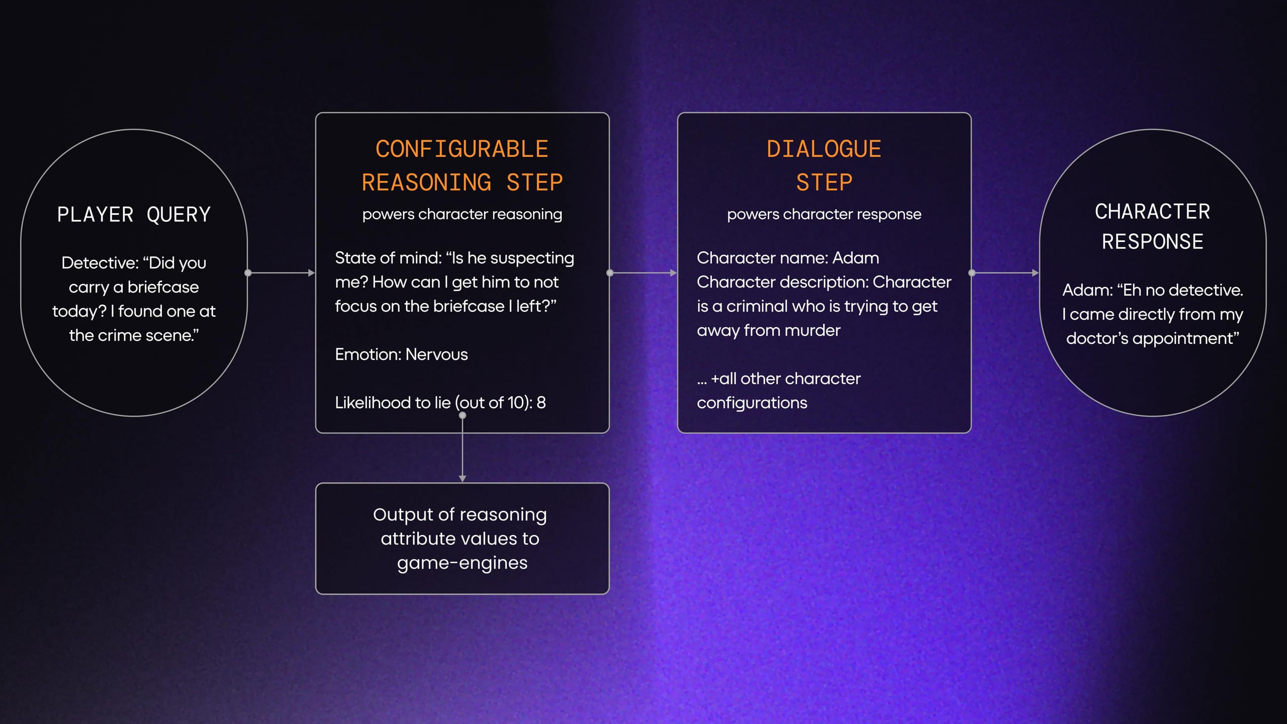 With all reasoning scenarios, our models also take into account the context of the conversation, character, and world – in addition to the reasoning step requested – before generating dialogue and action or passing triggers to the client side.