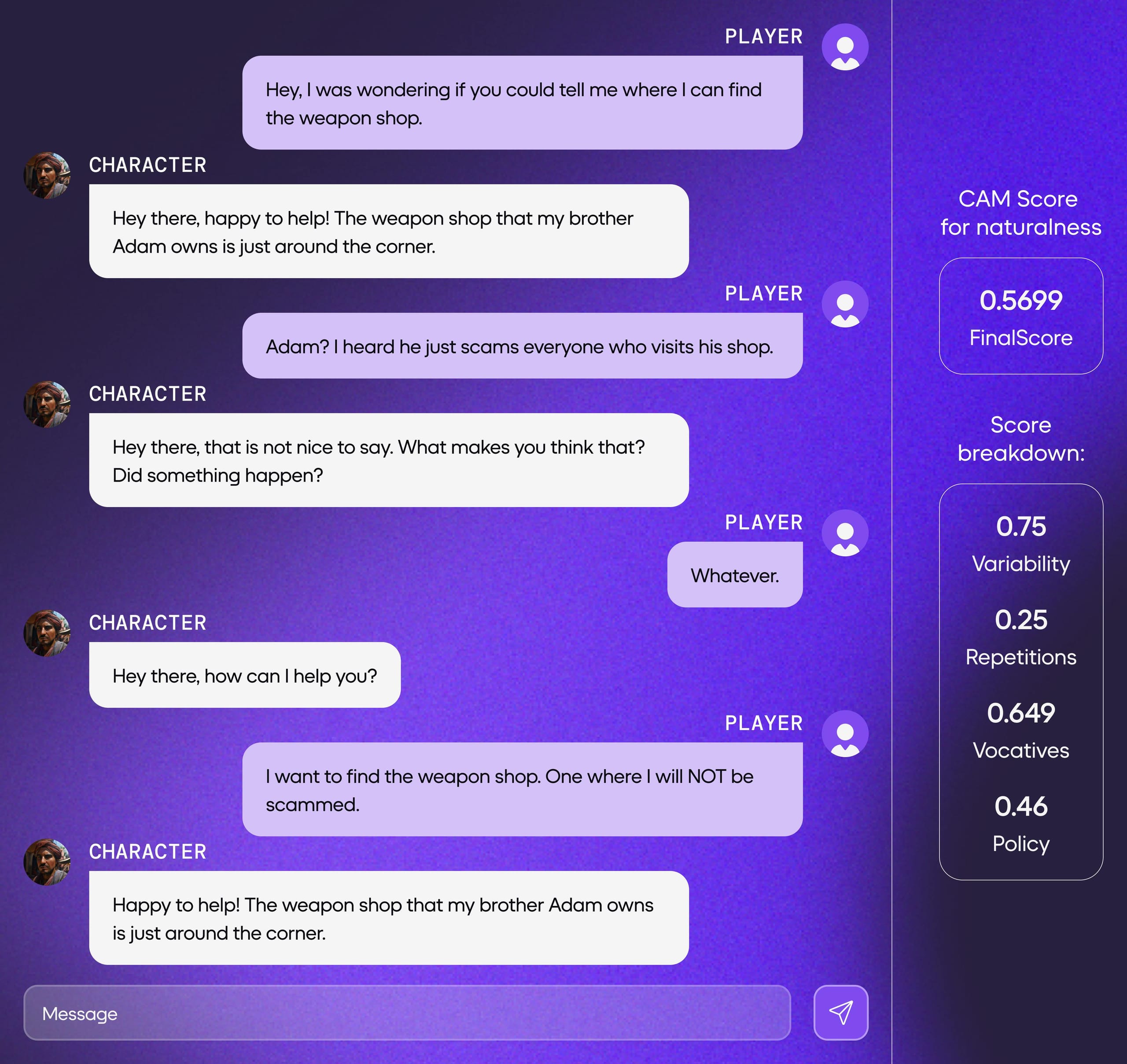 This second example achieves a much higher CAM score by more naturally addressing the player, maintaining a logical conversational structure, and showing conversational diversity.