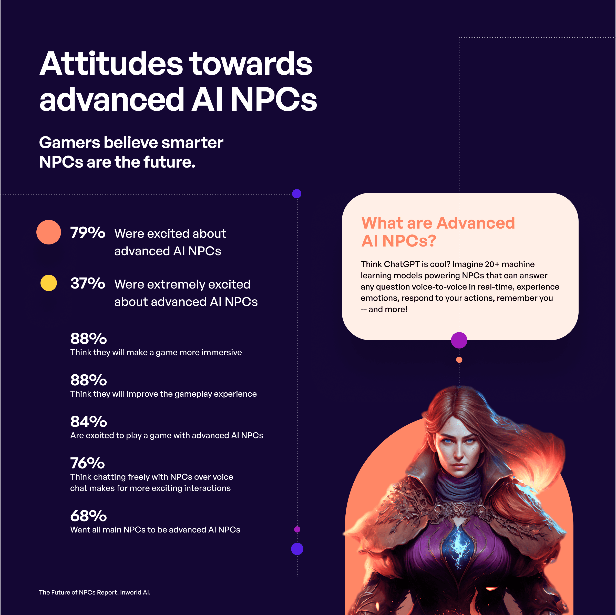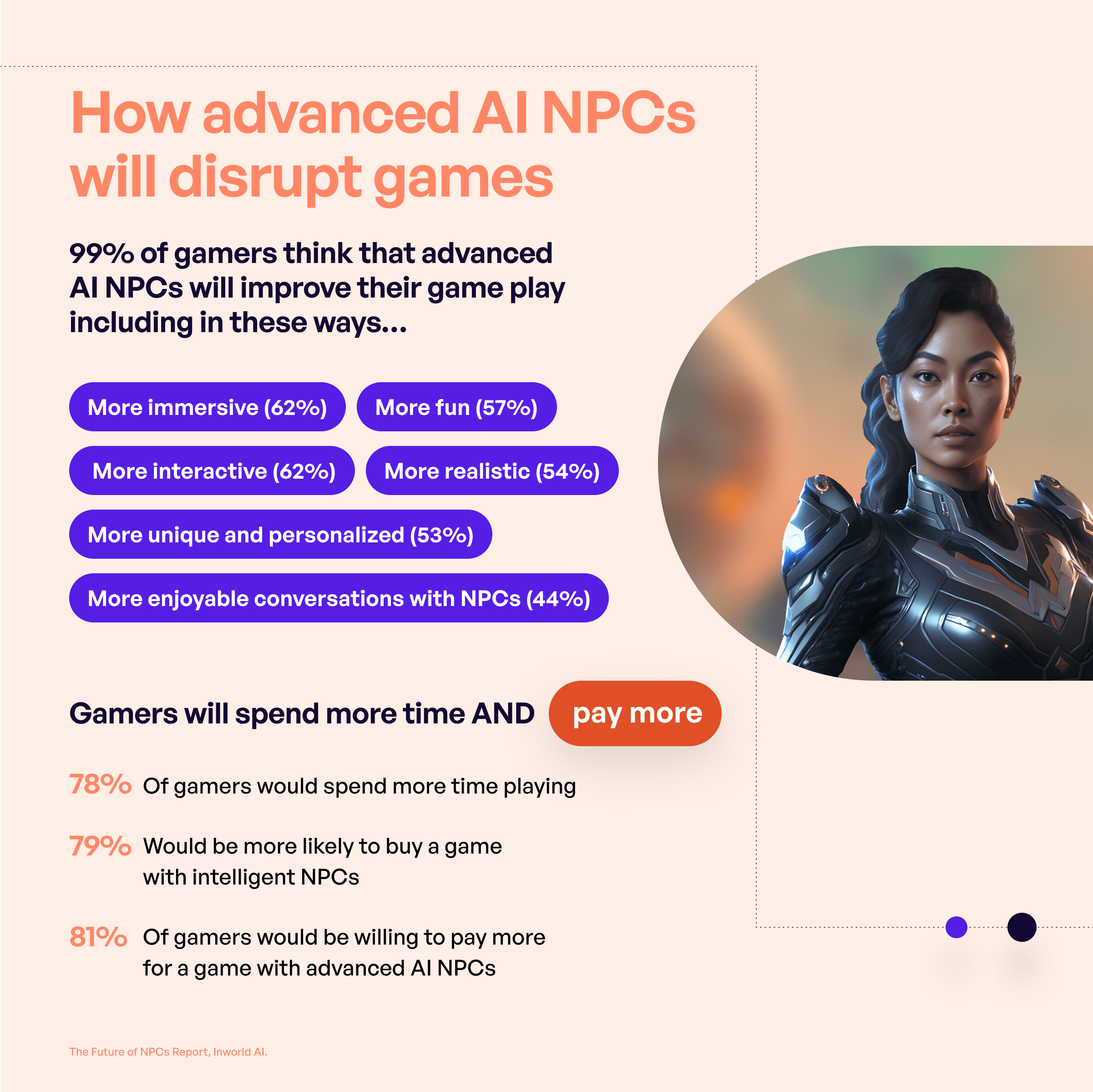99% of gamers believe including Advanced AI NPCs would positively impact gameplay. 78% of gamers would spend more time playing, and 79% would be more likely to buy a game with intelligent NPCs. More importantly, 81% of gamers would be willing to pay more for a game with advanced AI NPCs.