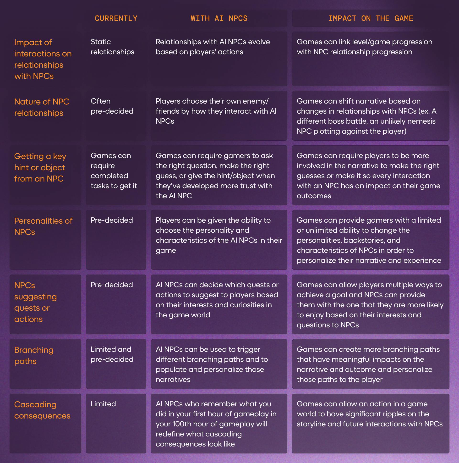 As you can see, the affordances for player agency expand exponentially with AI NPCs – giving game devs new abilities to personalize their video games to players and give players the agency to dynamically impact game narratives – without adding huge development and production costs.