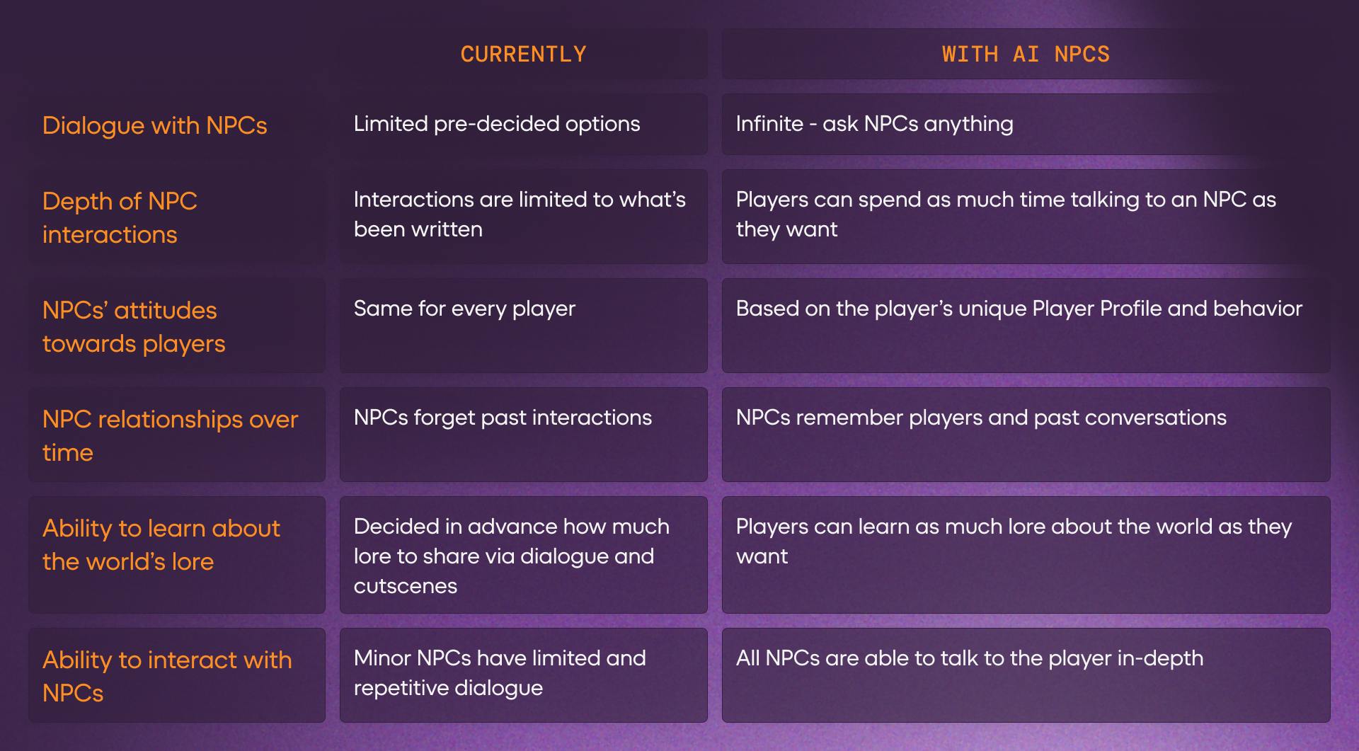 Here are just a few examples of how just the ability to talk to AI NPCs freely can be used to extend significantly more player agency to gamers. While AI NPCs expand what’s possible around player interaction, game developers can extend – or limit – those abilities to players in ways that fit with the path or experience that the developer is trying to create in the game: