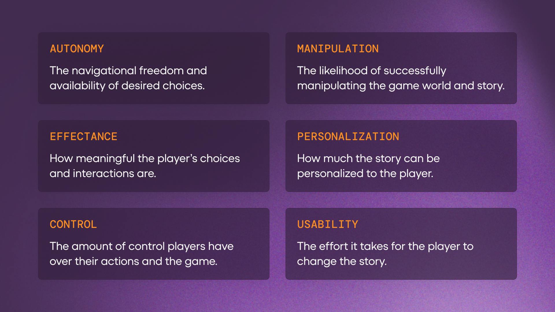 While none of the examples above necessarily impacts broader game narratives or represent the type of meaningful choices or branching paths that affect the outcome of a game, all of these examples provide the gamer with a much greater ‘perceived’ sense of agency, which research found was still able to increase the player’s sense of player agency and flow in video games.