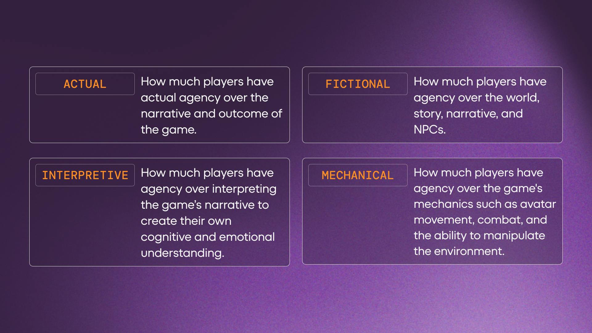 Player agency is not just one thing. Cole and Gillies have identified 4 types: