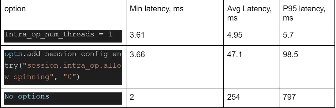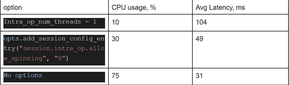 Recently, when we developed a new service with a small ONNX model, we found it had abnormally high CPU usage and decided to find the reason for it. In the end, we were able to reduce CPU usage from 47% to 0.5% without significantly increasing latency.