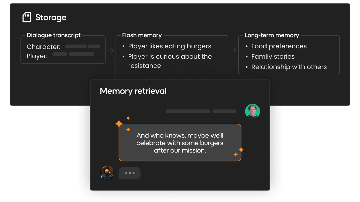 While Bloom has personality and knowledge that was created by Ubisoft’s narrative designers, he is also capable of ingesting real-time inputs from the player. In this situation, Inworld’s flash and long-term memory have noted Corbin Brown’s affinity for burgers, which Bloom brings back to the conversation, offering a more personalized and entertaining experience for the player.