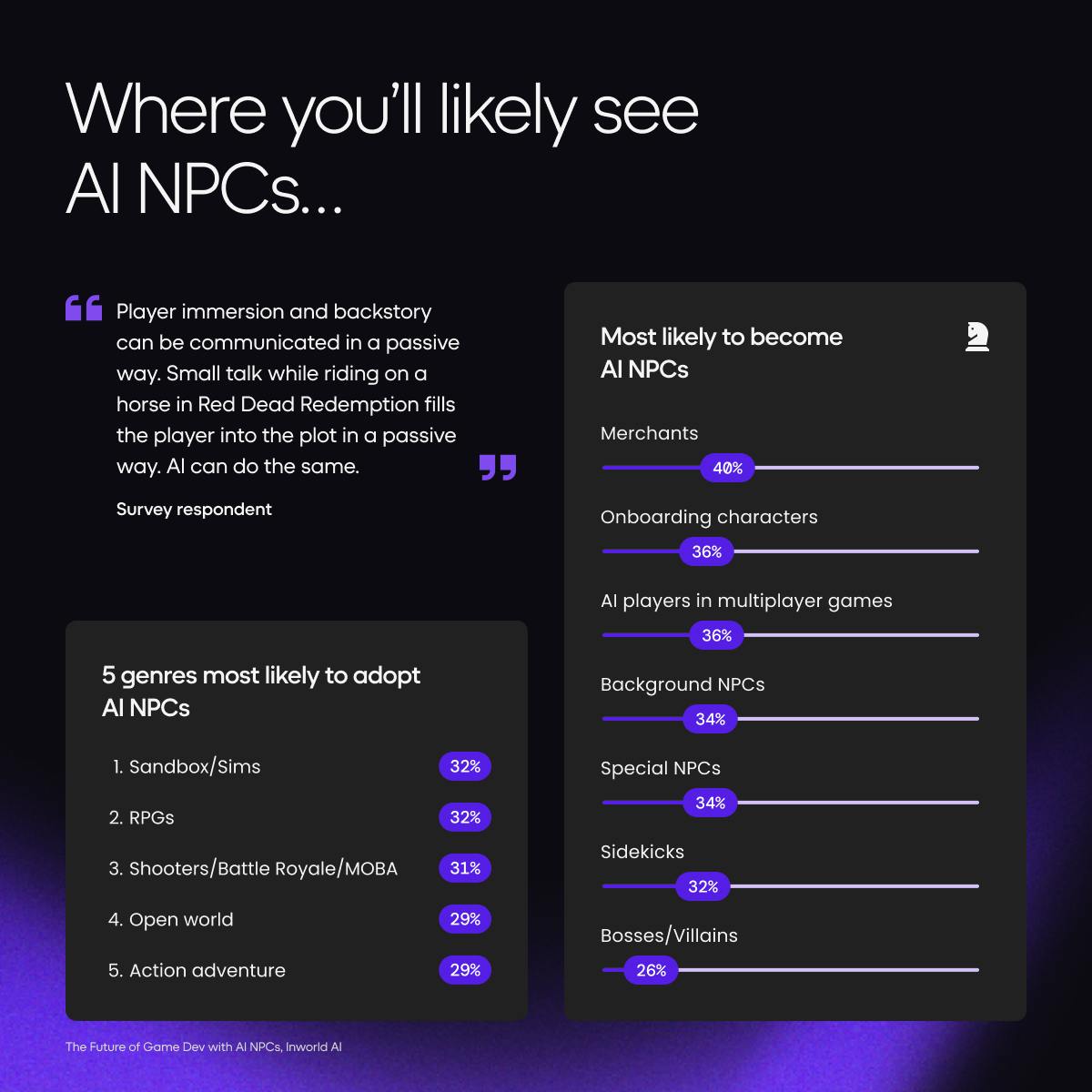 Sandbox, Sims, RPGs, and Open World games are all high on the list of genre devs expect to see AI NPCs in. That’s not surprise given it aligns with what our Future of NPCs report found last year.
