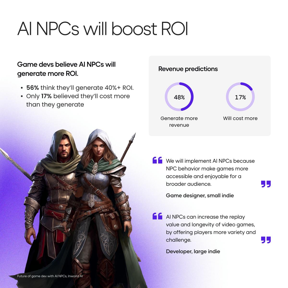 - Customer lifetime value: Our Future of NPC report’s findings align on this. It found that 77% of gamers would be more interested in buying an expansion pack if it included AI NPCs and 72% would be more likely to buy a sequel.